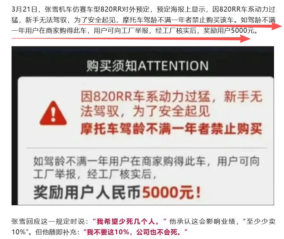 几个月后张雪机车大量进入市场后,一定会有人开着炸街,拍vlog,炫技,整活。然后就不可避免的一定会出事,甚至于会死人。